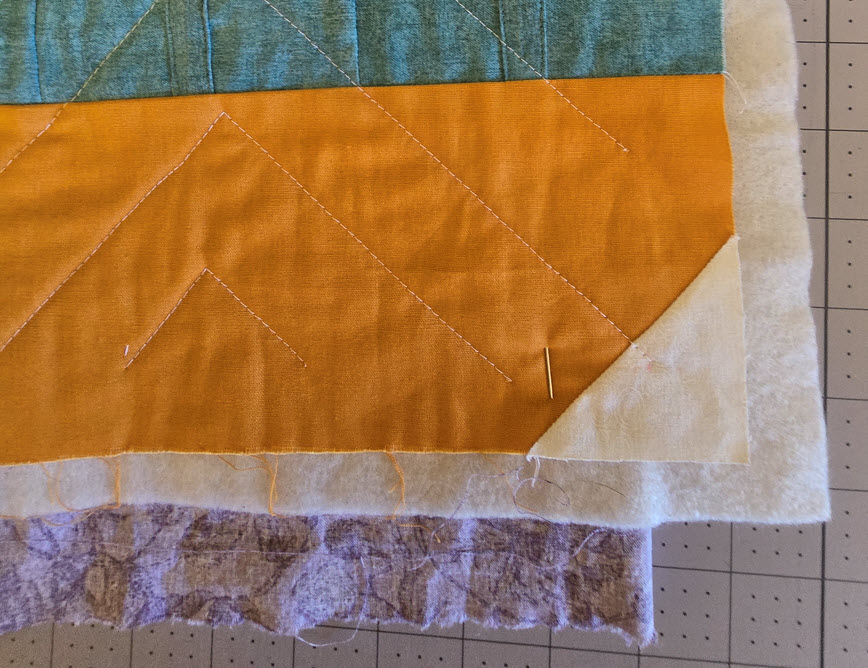 Pin the backing fabric away from the right-hand edge, keeping it clear of the quilt top and batting.