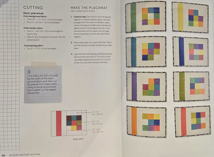 Below are pages 110 and 111 from Modern Machine Quilting by Catherine Redford, which show examples of making simple placements to practice different types of free-motion quilting.