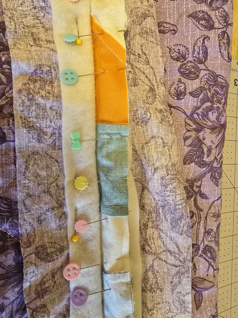 By this point, I wanted a finish that felt relaxed and forgiving rather than another opportunity to overthink decisions. I decided to use a scrappy binding, made from the leftover fabrics from the quilt itself. It felt like a fitting way to bring everything together and use what I already had.