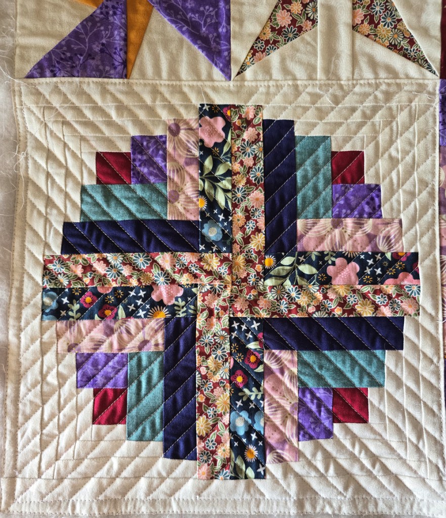Choosing how to quilt the quilt was far more challenging than I expected. My first instinct was to quilt each block with its own design, so I began by quilting radiating straight lines in the log cabin blocks. While this worked well on a small sample quilt sandwich, it was far too dense and visually overpowering on the actual quilt. I had quilted it just as densely as my practice piece, without realising that the larger scale didn’t need that level of quilting. In the end, I had to unpick it.
