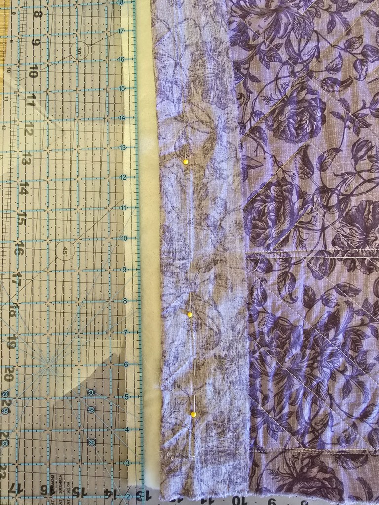 Take the right panel and pin the backing fabric away from the left-hand edge, keeping it clear of the quilt top and batting.