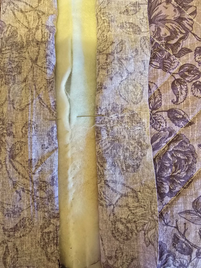 Once I had finished quilting the panels, it was time to join them together using a quilt-as-you-go method without sashing. There are variations of this technique, and I found Sugaridoo’s Quilt as You Go – How to Join Quilt Sections Without Bulky Seams helpful.